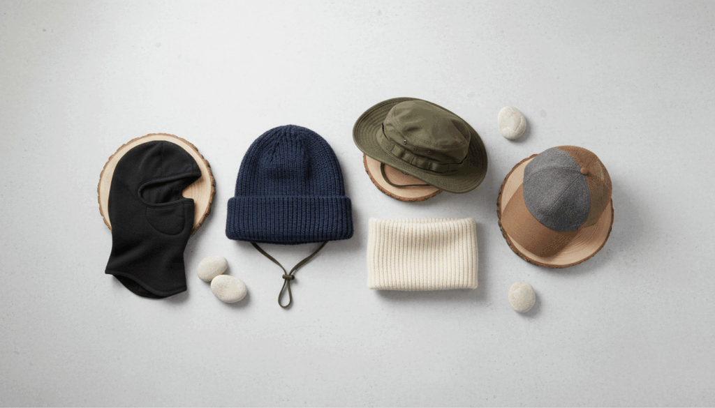 Typiske typer i denne kategori inkluderer beanies og knit hats til kolde dage, capser og kasketter til mildere vejr, solhatte til sommer og balaclava-cap til jagt og vinteraktiviteter. Overvej klima, aktivitet og hvorfor du skal vælge varme, vindbeskyttelse eller UV-beskyttelse. Pasform er vigtig; vælg størrelse eller en model med justerbar kant eller nakke. Pleje og holdbarhed spiller også en rolle, især ved våde eller krævende forhold.