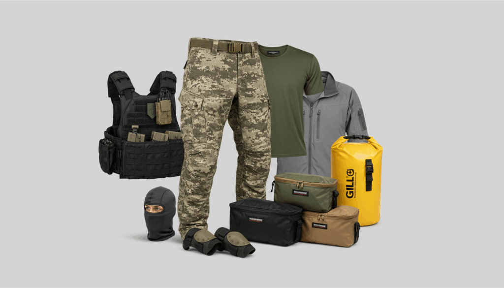 Vigtige egenskaber er ripstop-materialer, justerbar pasform, MOLLE-paneler og forstærkede syninger, der gør produkterne velegnede til airsoft, jagt og krævende udendørsaktiviteter. Beskyttelse som XPD Elbow Pads og MPS Death Head Balaclava giver ekstra komfort i felten.
