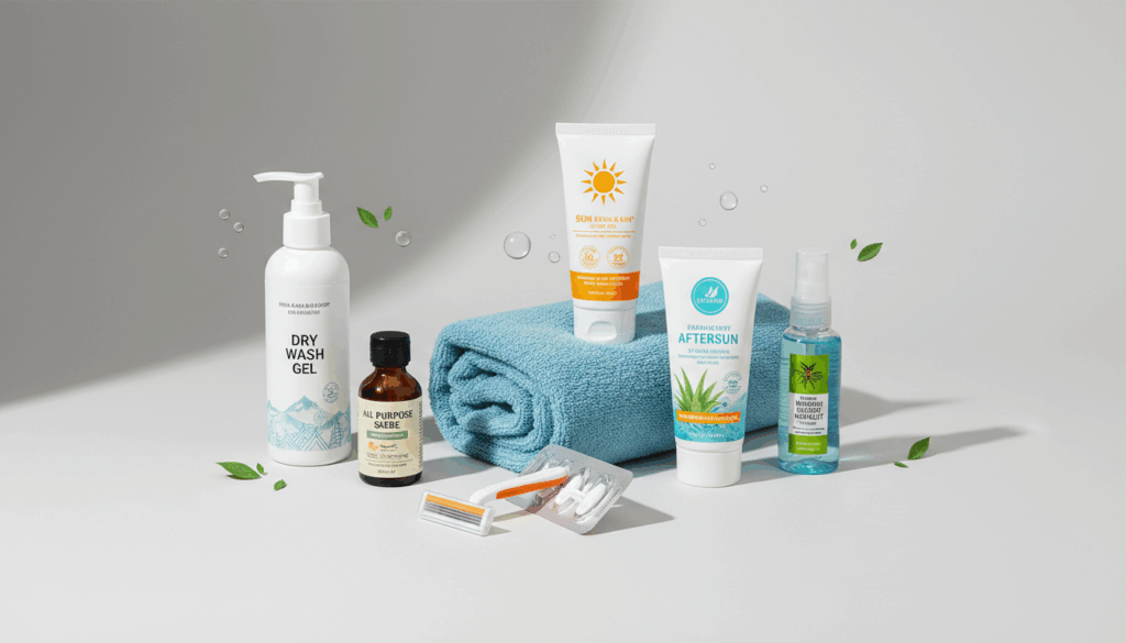 Typiske variationer inkluderer hånddesinfektion, Dry Wash Gel, solcreme med SPF og aftersun samt insektbeskyttelse og engangsbarberblade—alle i rejsevenlige beholdere, der fylder minimalt i tasken.