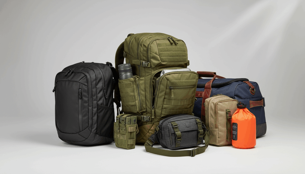 Fælles træk er komfort og organisering: ergonomiske bæresystemer, polstrede rygpaneler, justerbare skulderstropper og rummelige rum med lommer. Materialer spænder fra vandafvisende nylon til holdbare G-1000 og recycled polyester, med fokus på slidstyrke og vejrbestandighed.