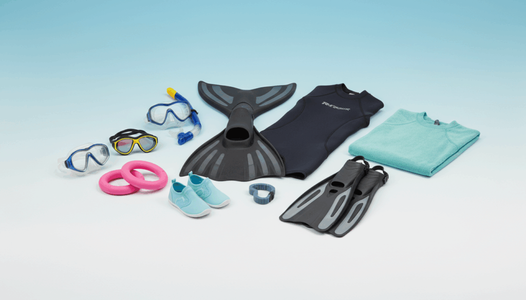Kendetegn ved vandsportudstyr er funktionalitet og brugervenlighed: justerbare stropper, anti-dug briller, full-dry snorkel og hydrodynamiske finner, samt UPF-solbeskyttelse i badetøj og poncho. Variationer dækker træning, fritid og rekreative ture til vands, med muligheder fra junior til voksen og fra enkle strandsko til tekniske svømmeveste.